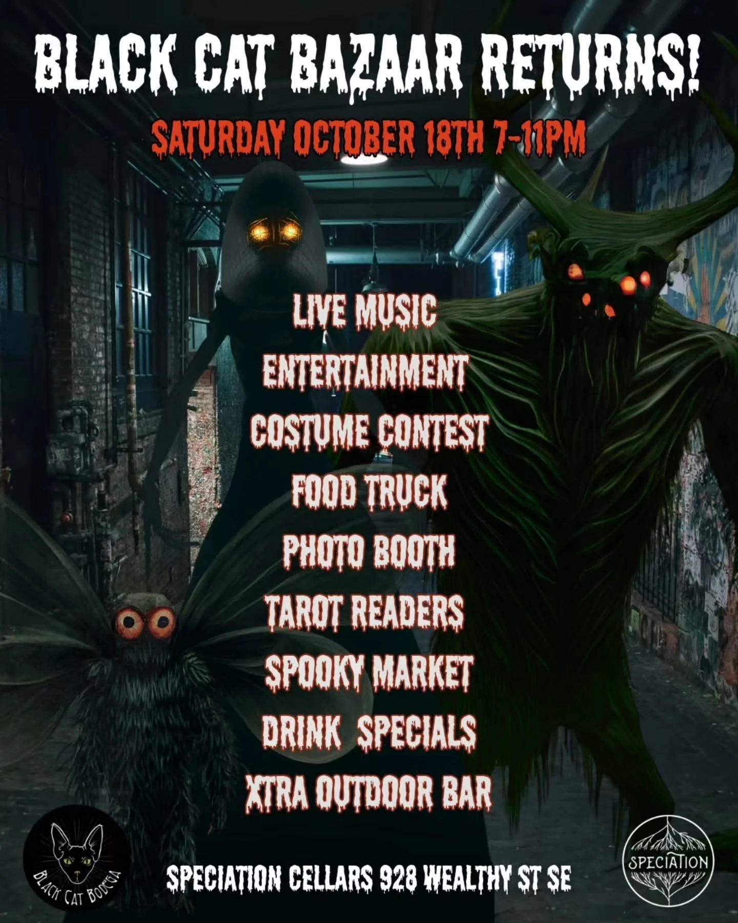 Oct 18 Black Cat Bazaar Saturday, October 18, 2025 7:00 PM 11:00 PM Speciation Cellars (map) Google Calendar ICS View Event →