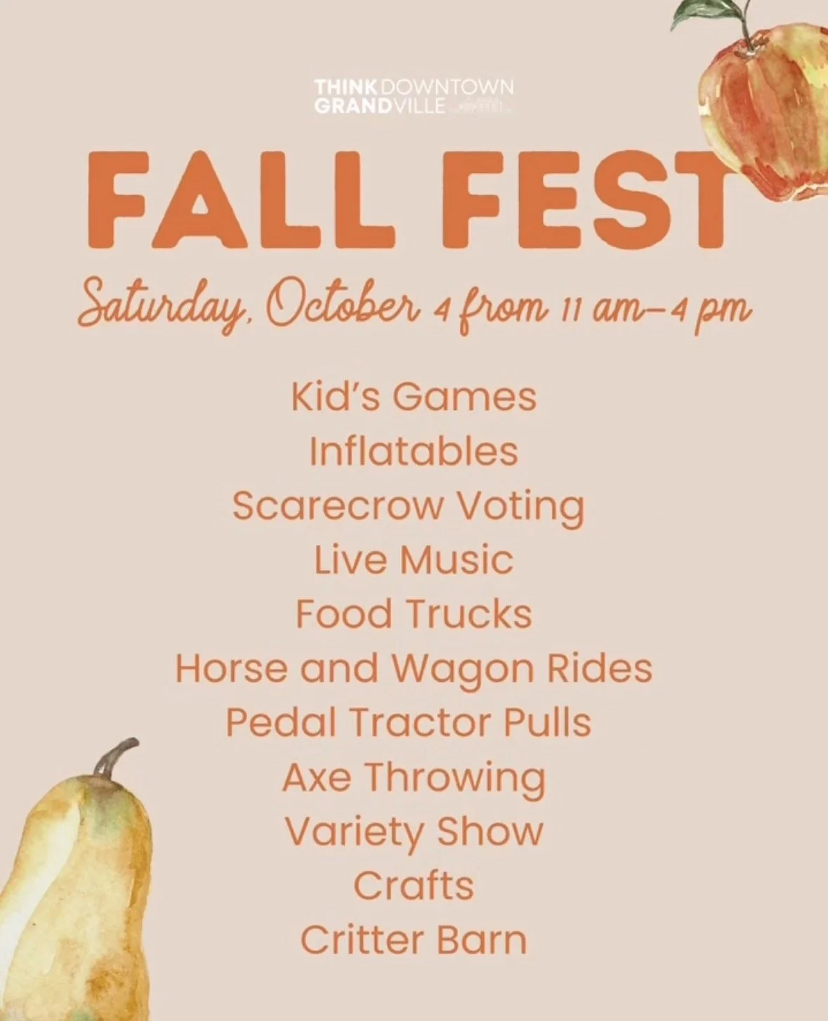 Oct 4 Downtown Grandville Fall Fest Saturday, October 4, 2025 11:00 AM 4:00 PM Downtown Grandville (map) Google Calendar ICS View Event →